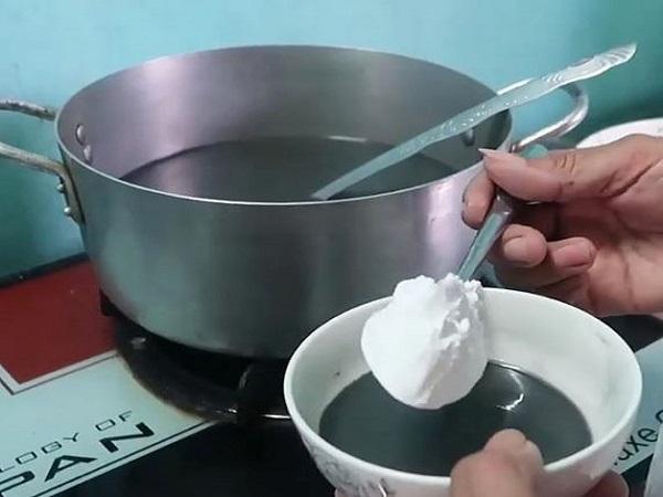 - Cho đường phèn và muối vào nồi, khuấy đều cho tan.